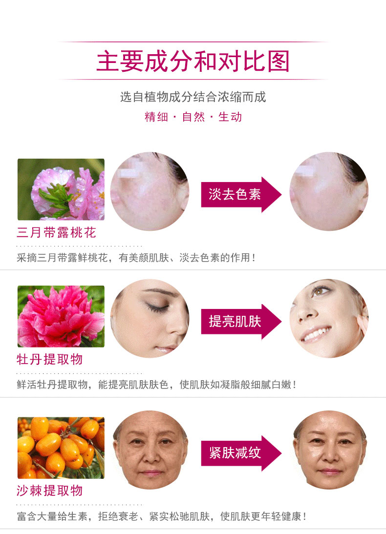 產(chǎn)品作用:補水潤膚、平衡水油、提亮肌膚、緊膚減紋。